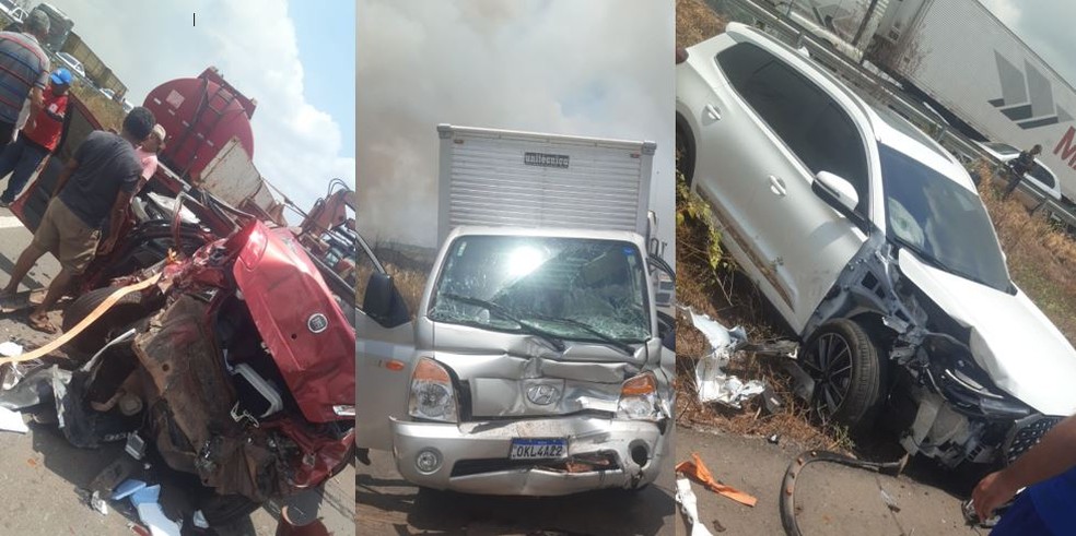 Imagens feitas por motoristas que passavam no local no momento do acidente mostram que vários veículos colidiram entre si e, entre eles, há uma viatura da Polícia Rodoviária Federal (PRF) e uma carreta com botijões de gás de cozinha (veja no vídeo acima).