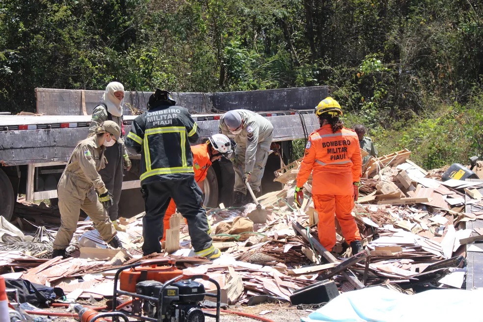 Uma vítima foi retirada da cabine, outra estava próxima à carga e a terceira foi retirada de debaixo das cerâmicas por volta das 11h.
