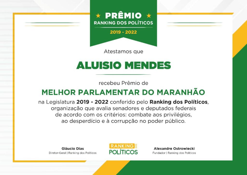 O deputado federal Aluísio Mendes (PSC) foi eleito pelo site Ranking dos Políticos como o melhor deputado federal da bancada maranhense na atual legislatura. O deputado já havia recebido prêmio semelhante no ano passado. “É uma honra receber este título e mais do que isso, de retribuir a confiança da população maranhense com trabalho e dedicação”, disse o deputado. Nas eleições deste ano ele concorre à reeleição.