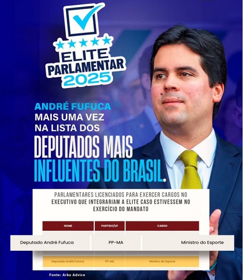 O deputado federal maranhense André Fufuca (PP) apareceu novamente na “Elite Parlamentar 2025” do Congresso Nacional; o parlamentar foi listado pela consultoria Arko Advice no rol dos “Parlamentares licenciados para exercer cargos no Executivo que integrariam a elite caso estivessem no exercício do mandato”.