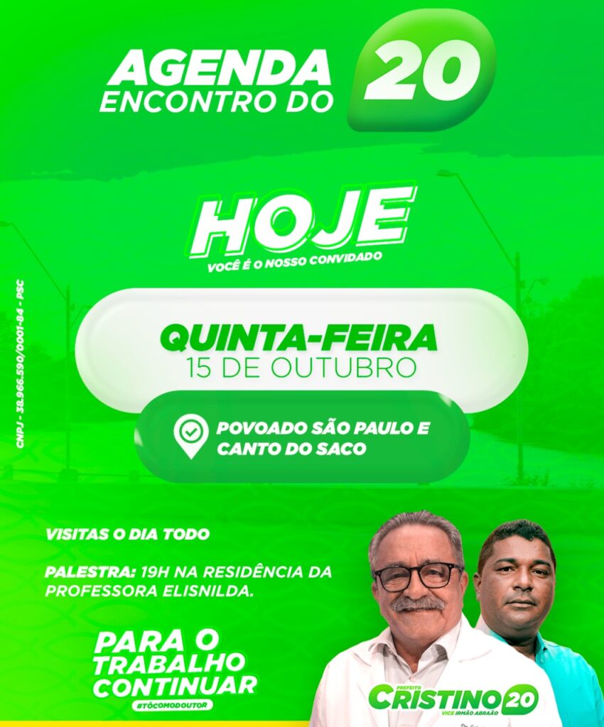 Araioses: Agenda do candidato a reeleição Dr. Cristino nessa quinta-feira 15 de outubro de 2020
