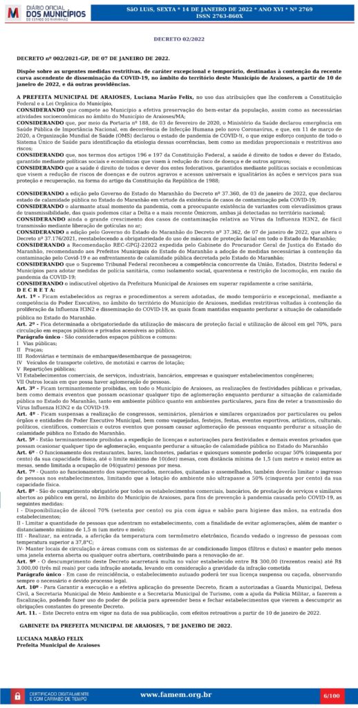 GABINETE DA PREFEITA MUNICIPAL DE ARAIOSES, 7 DE JANEIRO DE 2022.