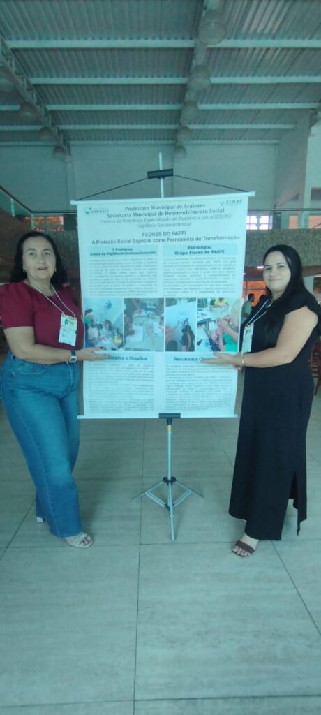 Representando Araioses, a técnica de Vigilância Maria da Conceição Silveira apresentou o projeto “Grupo Flores do PAEFI”, uma iniciativa desenvolvida pela equipe técnica do CREAS que fortalece vínculos, promove acolhimento e transforma histórias por meio do acompanhamento especializado.