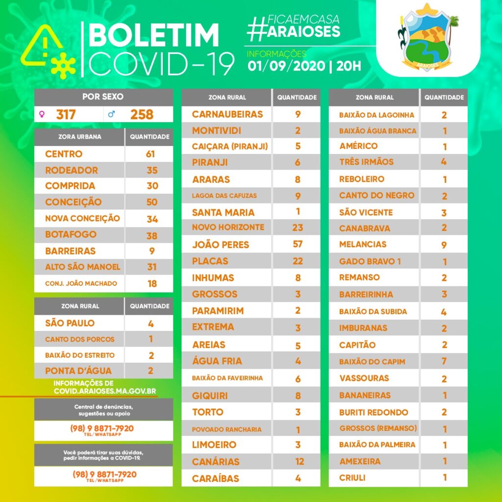 O total de casos confirmados em Araioses são 575. Há 17 pacientes ativos, 548 pacientes recuperados e 10 óbitos. Os casos CONFIRMADOS ATIVOS e casos SUSPEITOS que estão em ISOLAMENTO DOMICILIAR e INTERNADOS totalizam 57 e seguem sendo acompanhados pelo Município que está realizando todos os procedimentos de acordo com Secretaria de Estado de Saúde e Ministério da Saúde.