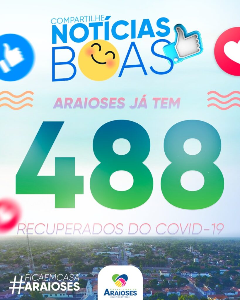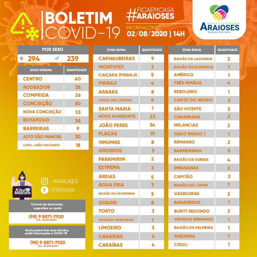 O total de casos confirmados em Araioses são 533. Há 35 pacientes ativos, 488 pacientes recuperados e 10 óbitos. Os casos CONFIRMADOS ATIVOS e casos SUSPEITOS que estão em ISOLAMENTO DOMICILIAR e INTERNADOS totalizam 56 e seguem sendo acompanhados pela Secretaria Municipal de Saúde Araioses que está realizando todos os procedimentos de acordo com Secretaria de Estado de Saúde e Ministério da Saúde.