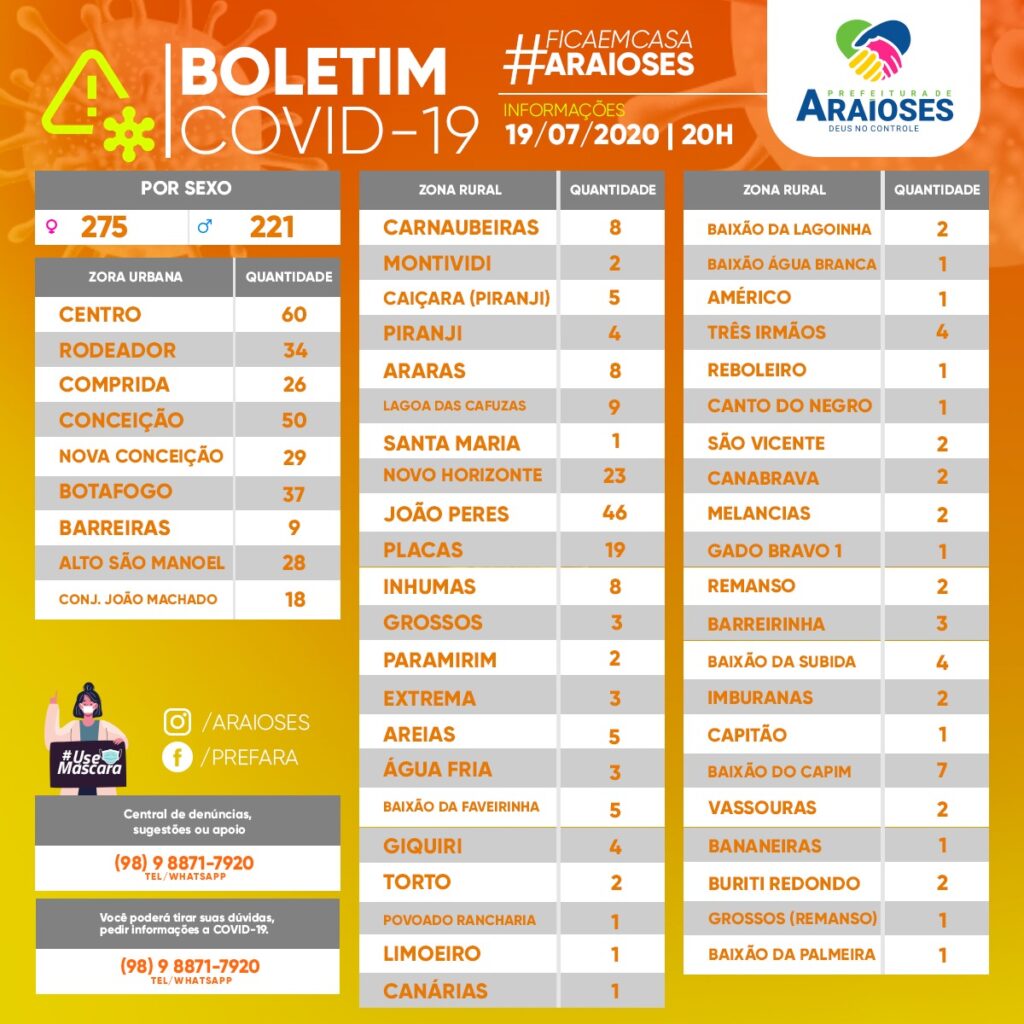 A Prefeitura de Araioses através da Secretaria Municipal de Saúde disponibiliza o Boletim Epidemiológico na data de 19 de julho de 2020 às 20h00min.