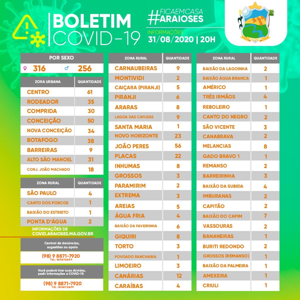 O total de casos confirmados em Araioses são 572. Há 18 pacientes ativos, 545 pacientes recuperados e 10 óbitos. Os casos CONFIRMADOS ATIVOS e casos SUSPEITOS que estão em ISOLAMENTO DOMICILIAR e INTERNADOS totalizam 56 e seguem sendo acompanhados pelo Município que está realizando todos os procedimentos de acordo com Secretaria de Estado de Saúde e Ministério da Saúde.