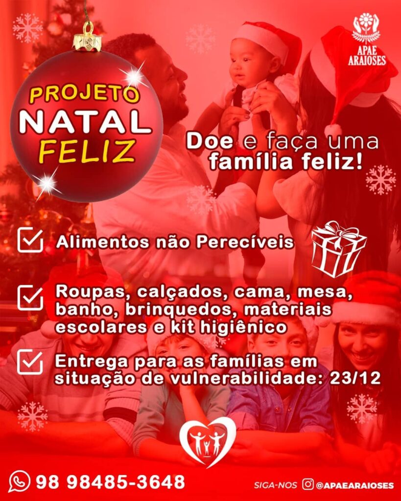 O Projeto Natal Feliz APAE está mais um ano promovendo uma ação solidária que acontecerá no dia 23/12/2021. A distribuição será feita por meio Caravana da equipe da APAE (Assistentes Sociais, Funcionários) que irão em famílias dos nossos assistidos e outros em situação vulnerabilidade do nosso Município de Araioses.