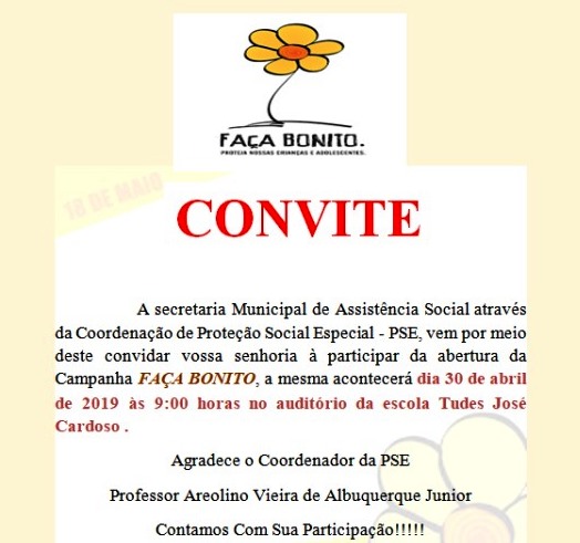 A secretaria Municipal de Assistência Social através da Coordenação de Proteção Social Especial – PSE, vem por meio deste convidar vossa senhoria à participar da abertura da Campanha FAÇA BONITO, a mesma acontecerá dia 30 de abril de 2019 às 9:00 horas no auditório da escola Tudes José Cardoso. Agradece o Coordenador da PSE Professor Areolino Vieira de Albuquerque Junior Contamos Com Sua Participação!!!!!