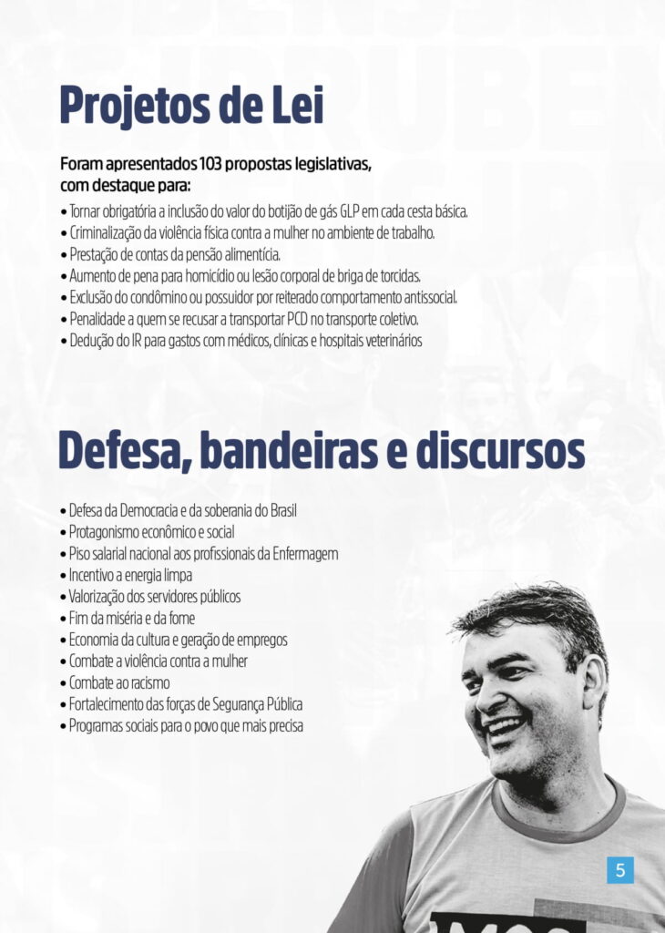 Rubens Jr parlamentar apresentou 103 propostas legislativas, entre projetos de lei, projetos de lei complementar e emendas à Constituição. O deputado federal também destinou 34 emendas que totalizam R$ 43,8 milhões.