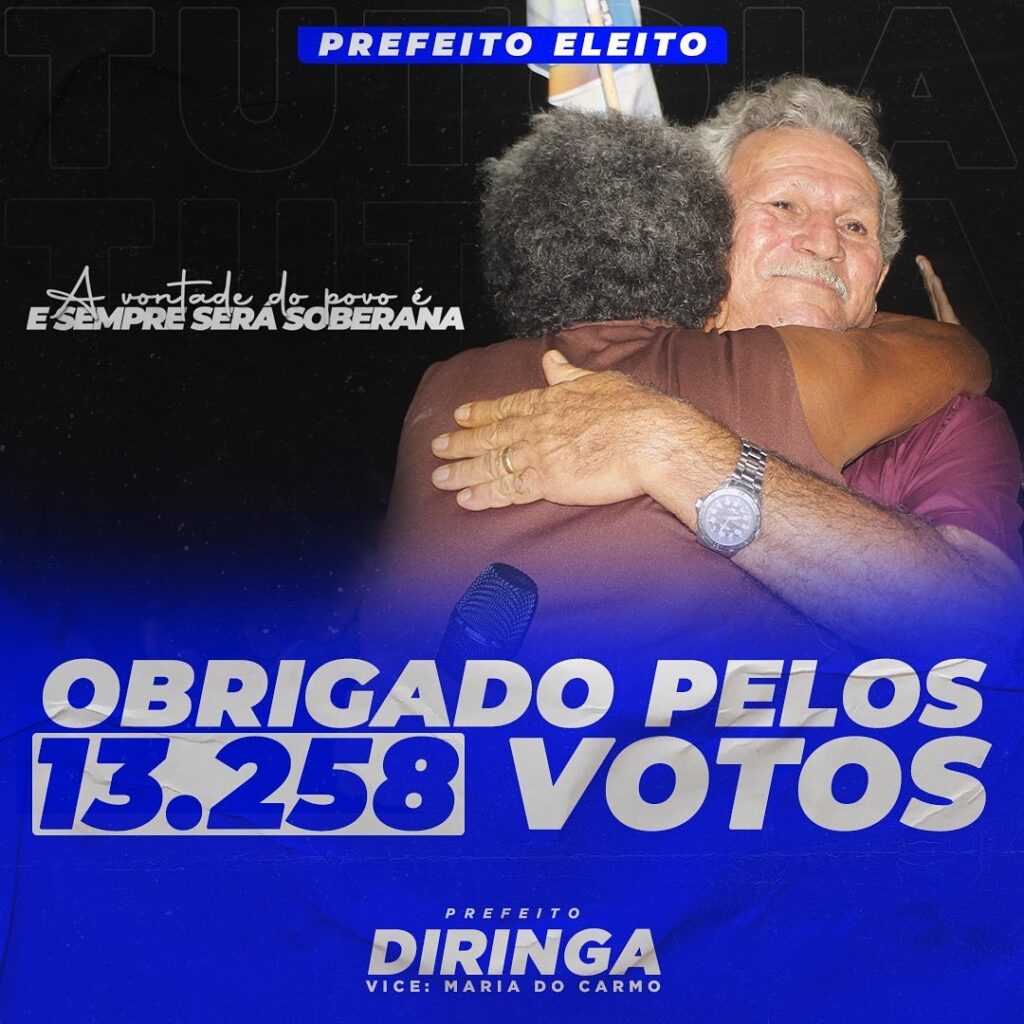 Diringa, do PDT, foi eleito, neste domingo (15), prefeito de Tutóia (MA) para os próximos quatro anos. Ao fim da apuração, Diringa teve 47,19% dos votos. Foram 13.258 votos no total.