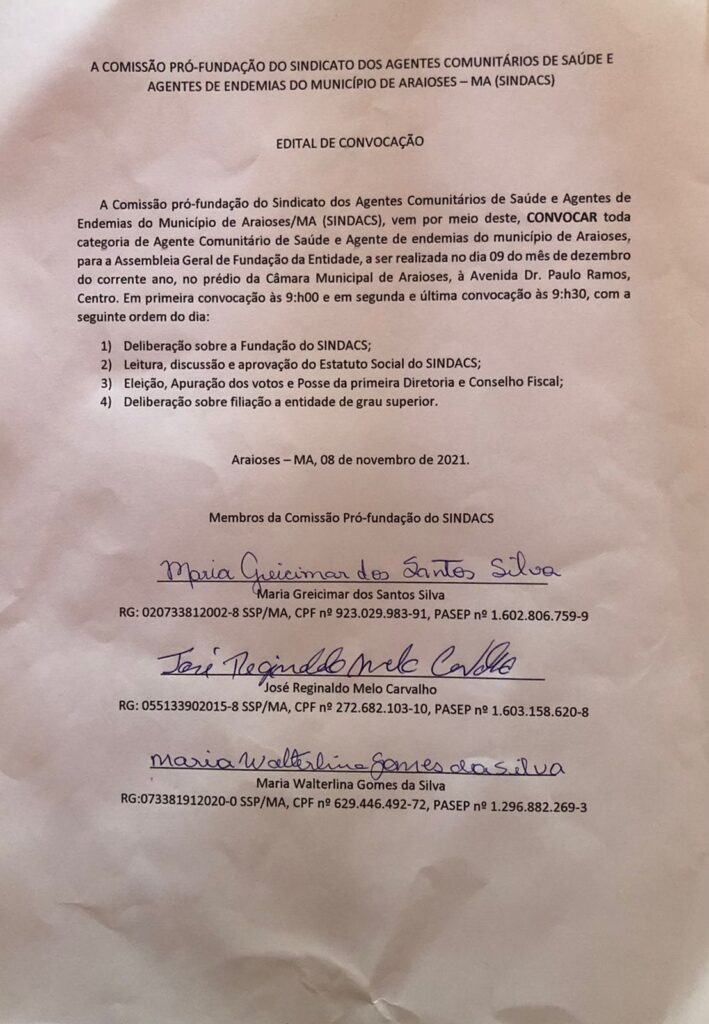 Edital de Convocação para fundação do Sindicato de ACS’s e Agentes de Endemias de Araioses