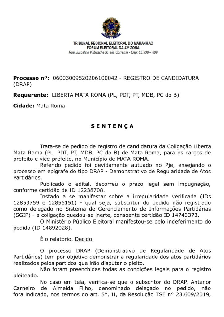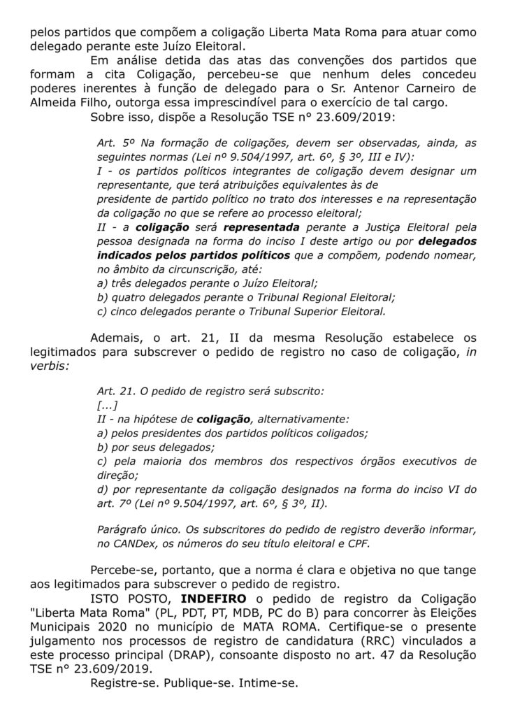 “No caso em tela, verifica-se que o subscritor do DRAP, Antenor Carneiro de Almeida Filho, denominado delegado no pedido, não fora indicado, nos termos do art. 5°, II, da Resolução TSE n° 23.609/2019, pelos partidos que compõem a coligação Liberta Mata Roma para atuar como delegado perante este Juízo Eleitoral. Em análise detida das atas das convenções dos partidos que formam a cita Coligação, percebeu-se que nenhum deles concedeu poderes inerentes à função de delegado para o Sr. Antenor Carneiro de Almeida Filho, outorga essa imprescindível para o exercício de tal cargo”, destacou a juíza.