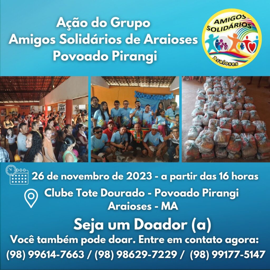 Neste mês, 26 de novembro, a partir das 16 horas, no povoado Pirangi, no Clube Tote Dourado, teremos um grande evento do Grupo Amigos Solidários de Araioses.