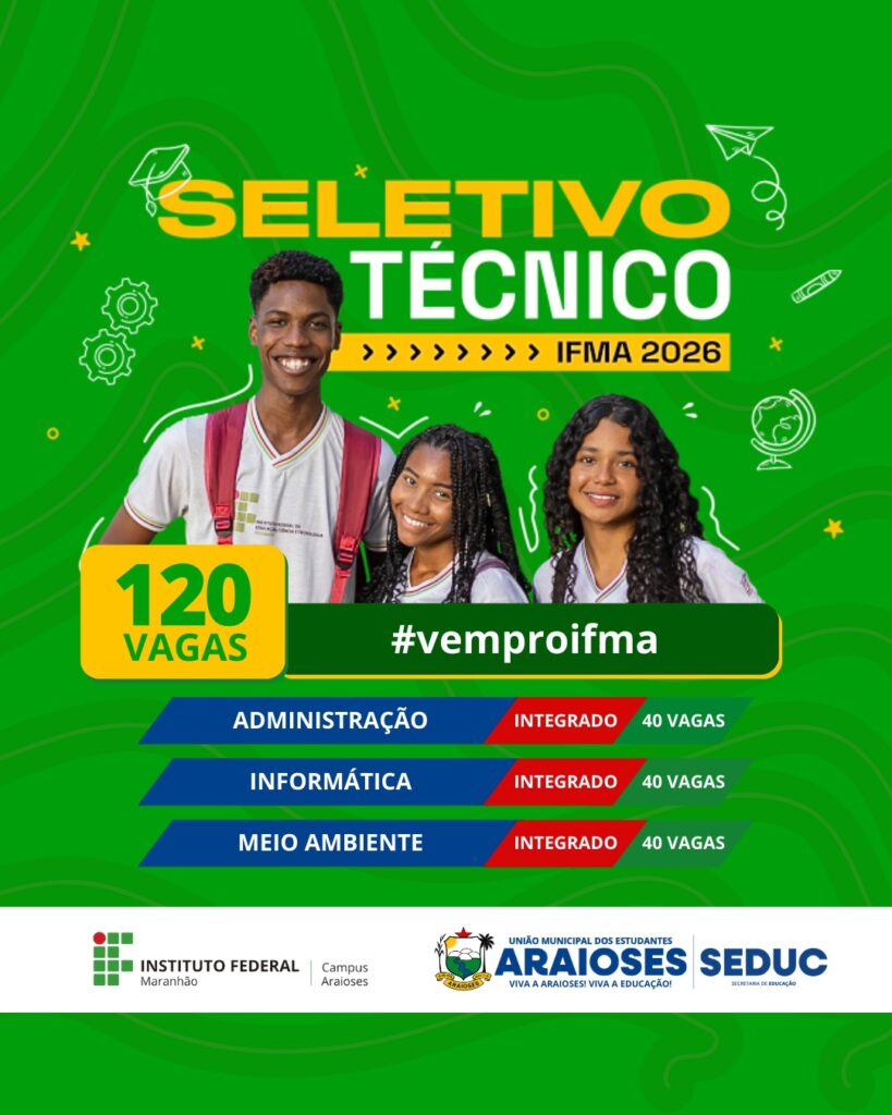 O IFMA – Campus Araioses está com 120 vagas abertas para os cursos técnicos integrados ao ensino médio: