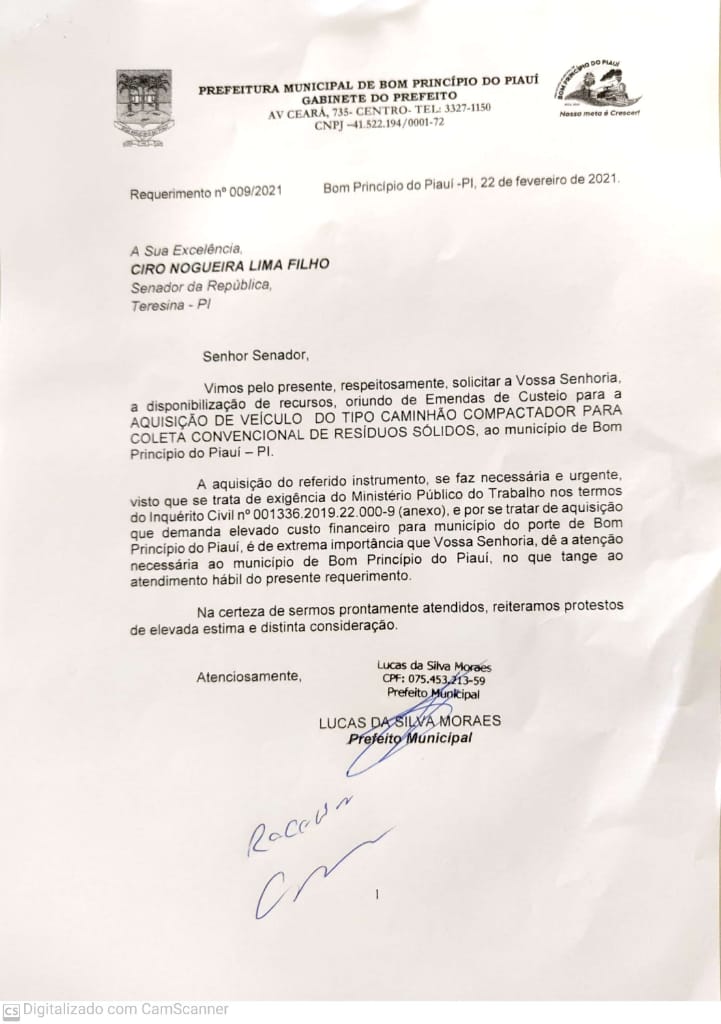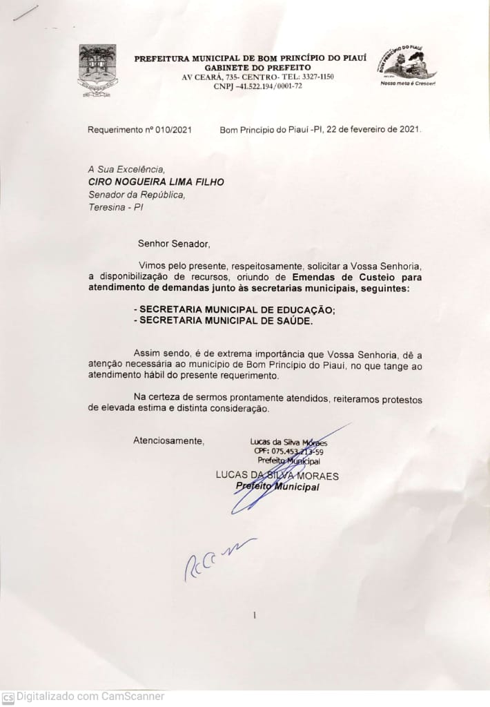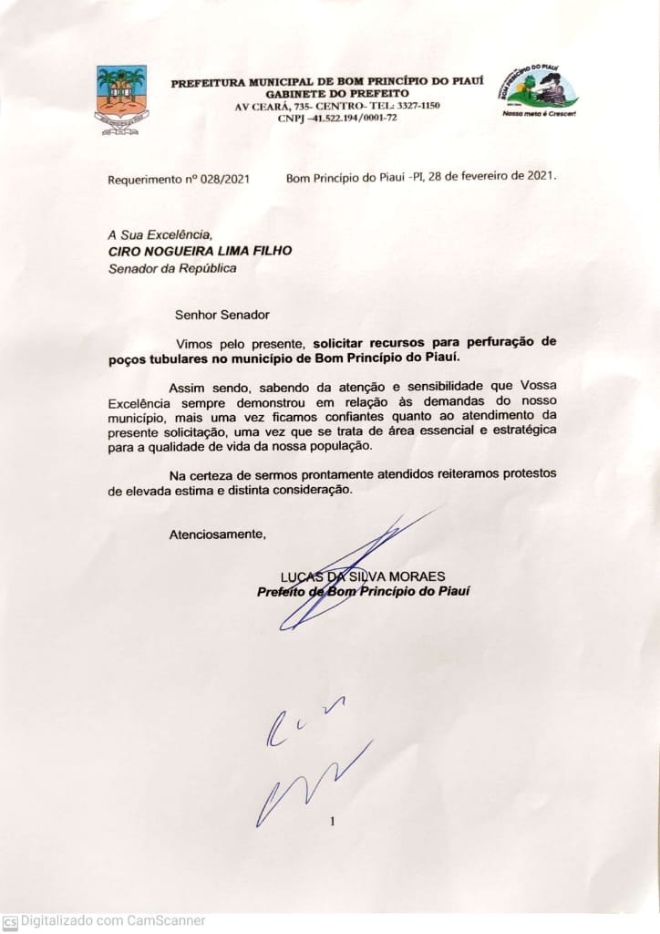Na tarde de hoje, domingo (28/02), o prefeito Lucas Moraes (DC), recepcionou no Aeroporto Internacional Prefeito Dr. João Silva Filho em Parnaíba, o senador Ciro Nogueira (PP) onde na oportunidade entregou ao senador onze ofícios, solicitando diversas ações e emendas ao município de Bom Princípio do Piauí.