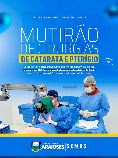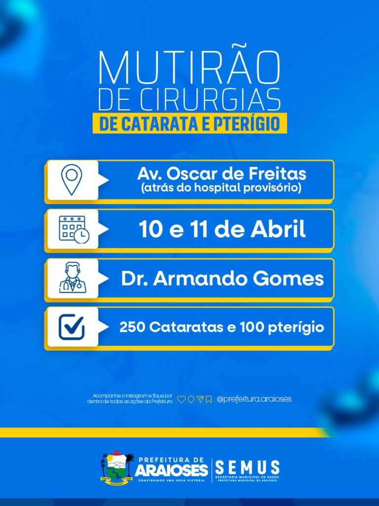 A Prefeitura de Araioses, por meio da Secretaria Municipal de Saúde, realizará nos dias 10 e 11 de abril um importante mutirão de cirurgias oftalmológicas no município.