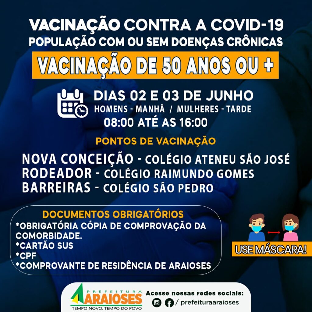 Dessa vez a vacinação é para pessoas de 50 anos ou mais com ou sem doenças crônicas, sendo que está ocorrendo no Colégio Ateneu São José no Centro, no Colégio Raimundo Gomes no Bairro Botafogo e no Colégio São Pedro em Barreiras.