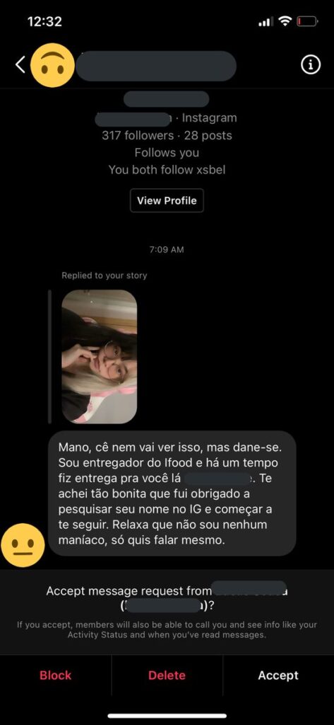 “Mano, você nem vai ver isso, mas dane-se. Sou entregador do iFood e há um tempo fiz entrega para você. Te achei tão bonita que fui obrigado a procurar seu nome no Instagram e começar a te seguir. Relaxa que não sou nenhum maníaco, só quis falar mesmo”, escreveu o homem na mensagem.