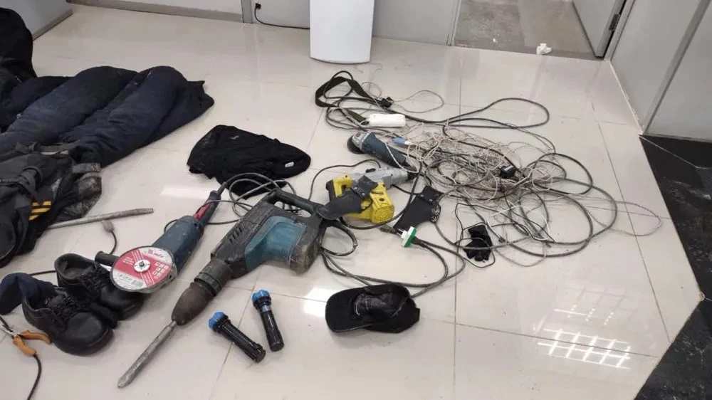 Com os criminosos, os policiais apreenderam um martelete grande, uma lixadeira grande, um martelete pequeno, lixadeira pequena, discos de cortes, extensões de energia, duas lanternas, dois coletes a prova de balas, um revólver calibre 38, 18 munições calibre 38 intactas além de um alicate.