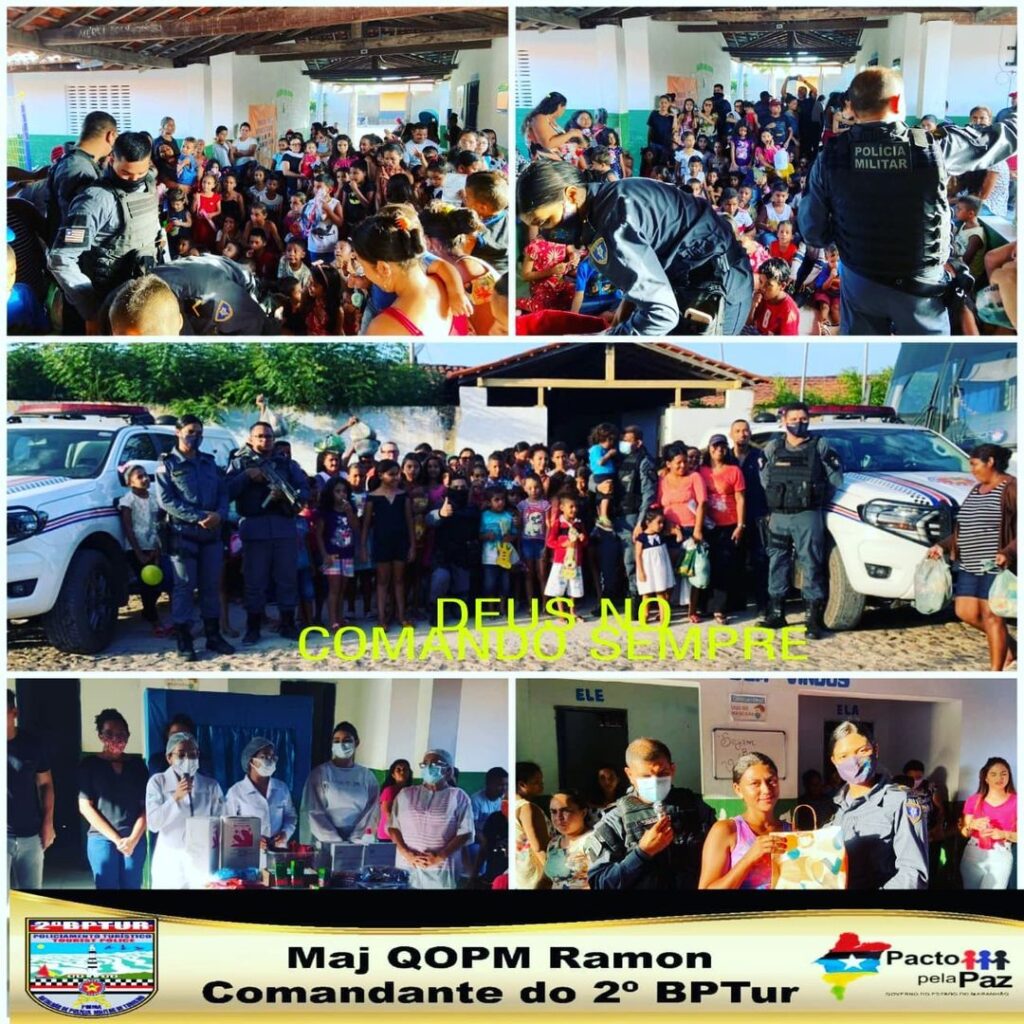 Policiais Militares da 4° cia do 2° BPTur juntamente com a Igreja de Deus El Shaday realizam Natal Solidário no Povoado Carnaubeiras, onde foram realizados atendimentos com profissionais na área da saúde, doações de cestas básicas, atividades com crianças e distribuição de brinquedos trazendo alegria e satisfação a comunidade local, e aproximando ainda mais a sociedade da Polícia Militar.