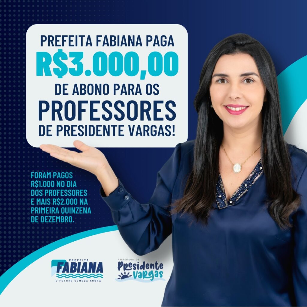 A prefeita de Presidente Vargas Fabiana Mendes destinou, na primeira quinzena deste mês, um abono salarial completando R$ 3 mil aos professores do município. Desse total, R$ 1 mil foram pagos no Dia dos Professores (saiba mais) e mais R$ 2 mil no início de dezembro.