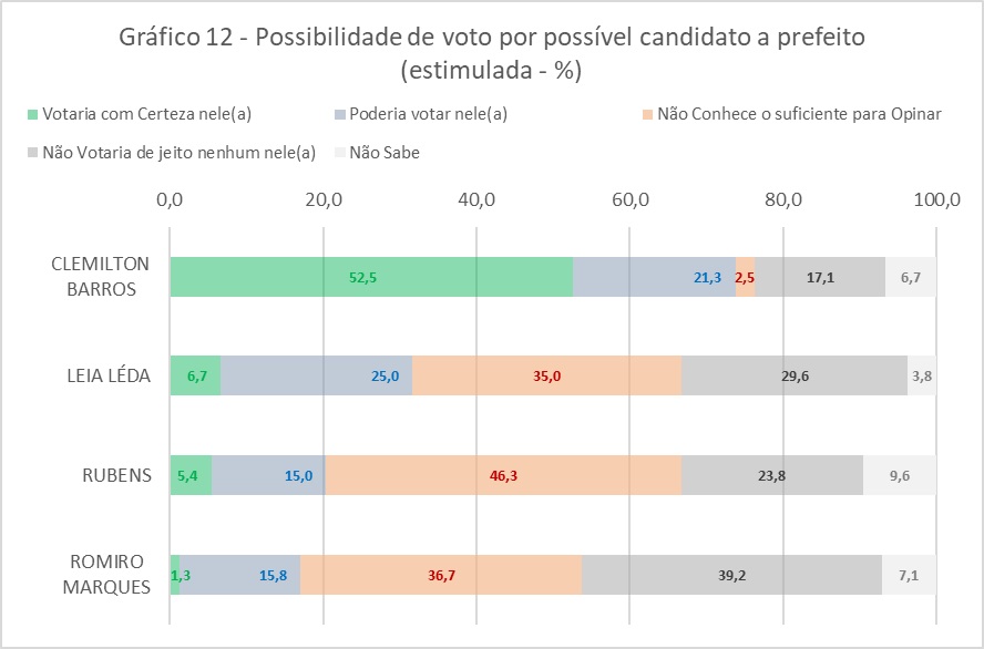 No potencial de voto, Clemilton Barros se destacou com 52,5% dos entrevistados afirmando que votariam nele com certeza e 21,3% indicando que poderiam votar nele. Os resultados indicam que o atual prefeito é o candidato com maior quantidade de voto, sugerindo um forte apoio entre os eleitores.
