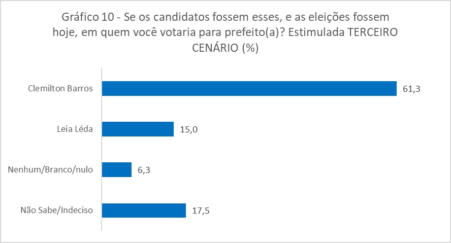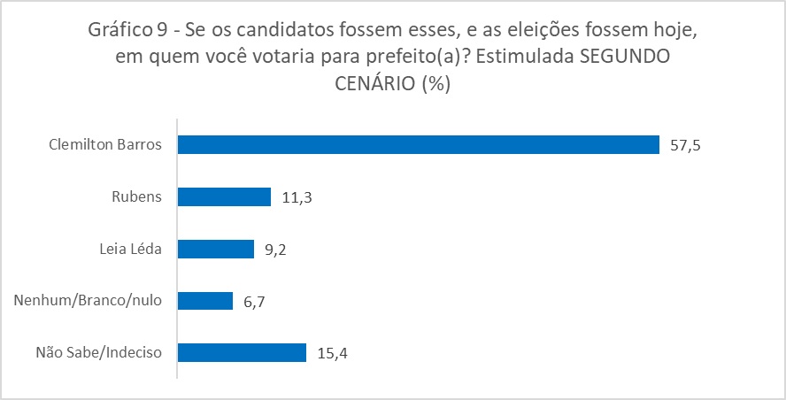 No segundo cenário da pesquisa, Clemilton Barros continua na frente, com 57,5% das intenções de voto, seguido por Rubens com 11,3% e Leia Léda com 9,2%. A porcentagem daqueles que não escolheriam nenhum candidato ou votariam em branco ou nulo aumentou ligeiramente para 6,7%.