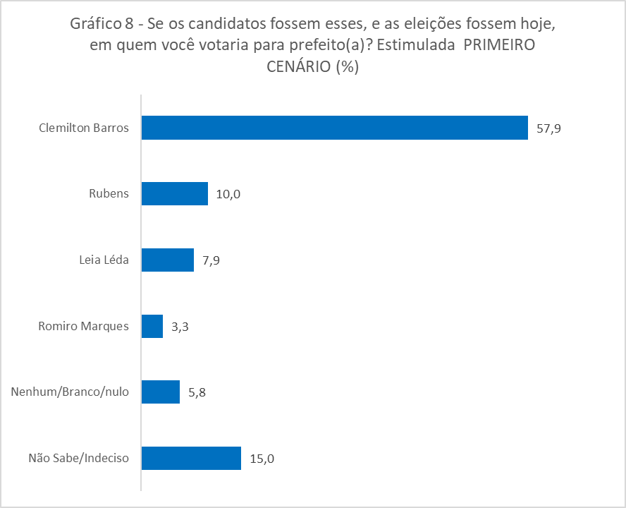 De forma estimulada, o primeiro cenário mostrou que Clemilton Barros mantém a liderança, com expressivos 57,9% das respostas. Rubens e Leia Léda aparecem bem distantes, com 10,0% e 7,9%, respectivamente, enquanto Romiro Marques registra apenas 3,3%. Além disso, 5,8% dos entrevistados declararam a intenção de votar em branco, nulo ou na opção “Nenhum”.