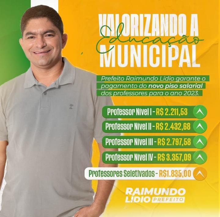 Por meio do DECRETO Nº 034, DE 26 DE JANEIRO DE 2023, a Prefeitura de Paulino Neves, reajusta o vencimento dos profissionais da educação básica de Paulino Neves, do quadro efetivo, majorando-os ao valor do piso salarial nacional estabelecido para o exercício 2023.