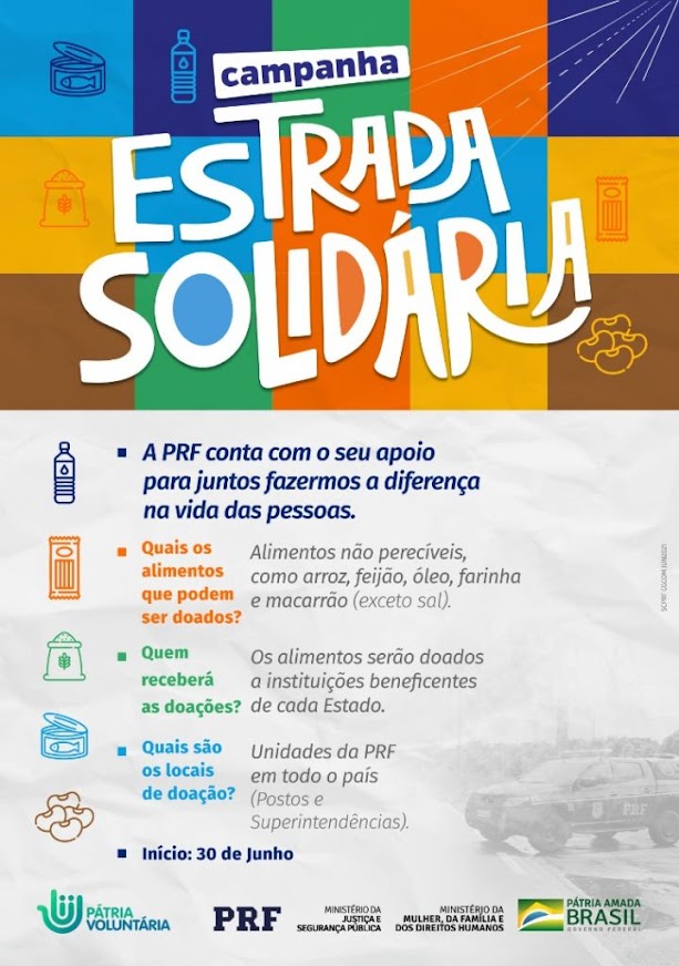 Diante das necessidades causadas pela pandemia do coronavírus, a Polícia Rodoviária Federal (PRF), através da campanha Estrada Solidária, pretende formar uma rede de apoio em todo o país. O objetivo da ação, que será realizada do dia 30 de junho a 8 de agosto, é arrecadar alimentos para doar a indivíduos em situação de vulnerabilidade.