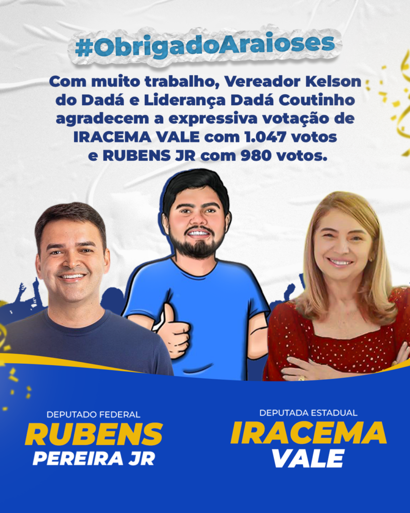 Contando com votos expressivos da população araiosense, Rubens Junior foi reeleito para mais um mandato na Câmara Federal, conquistando 980 votos e Iracema Vale, a deputada mais votada do Maranhão, conquistou 1.047 votos no município.