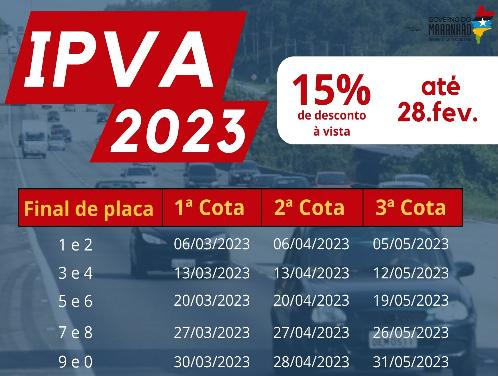 Já o pagamento do IPVA 2023 será disponibilizado no sistema da Secretaria de Fazenda a partir de Janeiro de 2023. Vale destacar que o contribuinte não precisa se deslocar às agências de atendimento da Sefaz para regularização do IPVA. Todos os serviços de pagamento e parcelamento estão disponíveis na página do IPVA, no site da Secretaria de Fazenda no endereço: portal.sefaz.ma.gov.br.