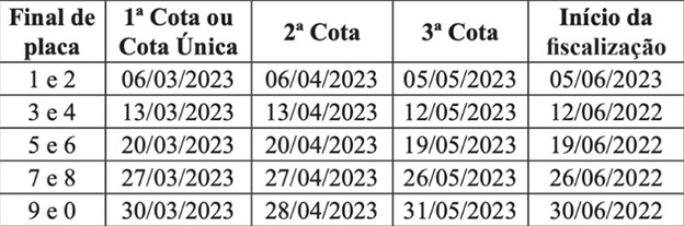 Os proprietários de veículos que optarem pelo parcelamento do IPVA 2023 realizarão o pagamento da primeira cota de acordo com o final da placa dos veículos, conforme tabela.